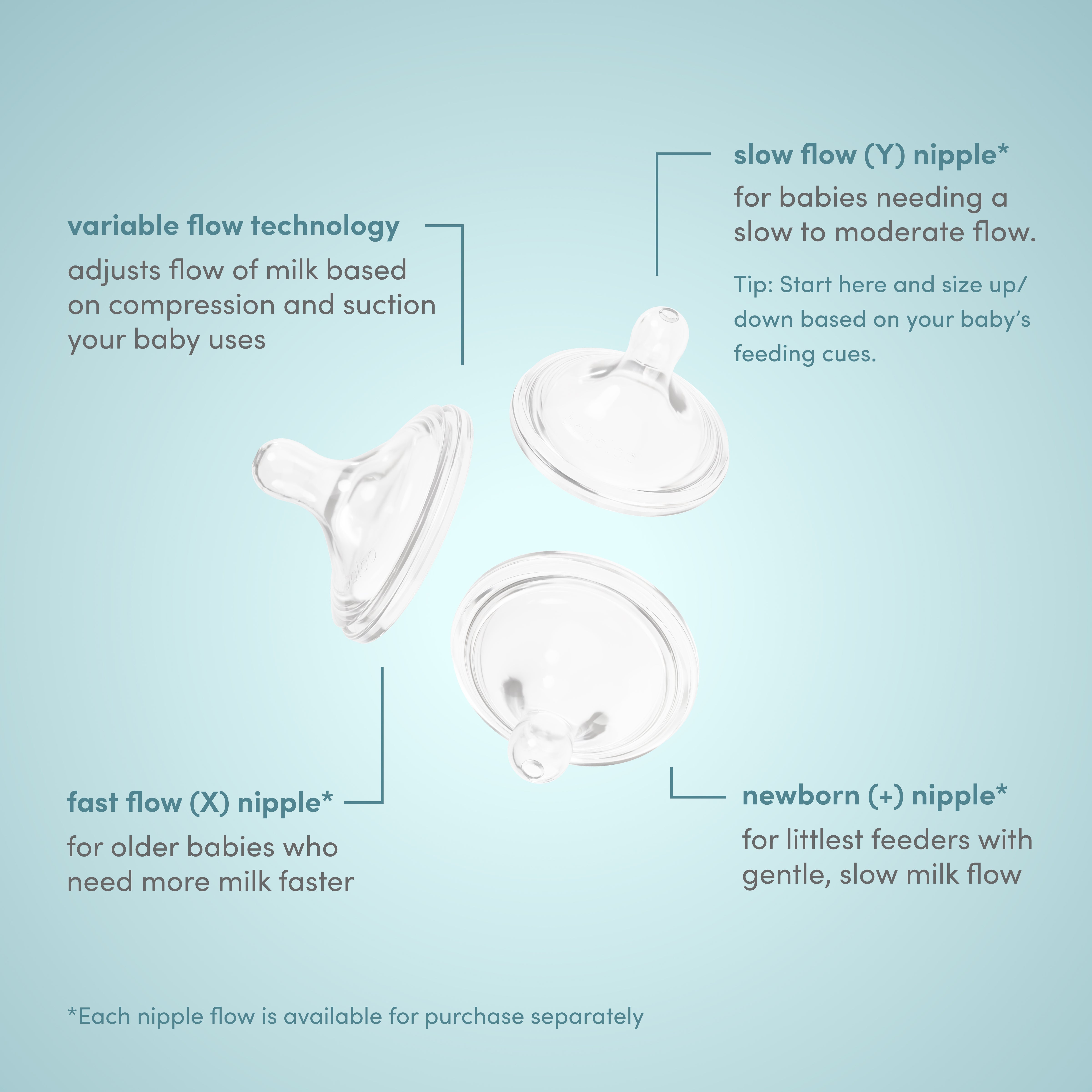 Options de débit : Nouveau-né, Débit lent, Débit rapide. Si bébé semble satisfait et ne laisse couler que très peu de lait, le débit est probablement correct. Si bébé laisse couler beaucoup de lait, le débit est trop rapide. Si bébé pleure et semble frustré par le débit, il est trop lent.